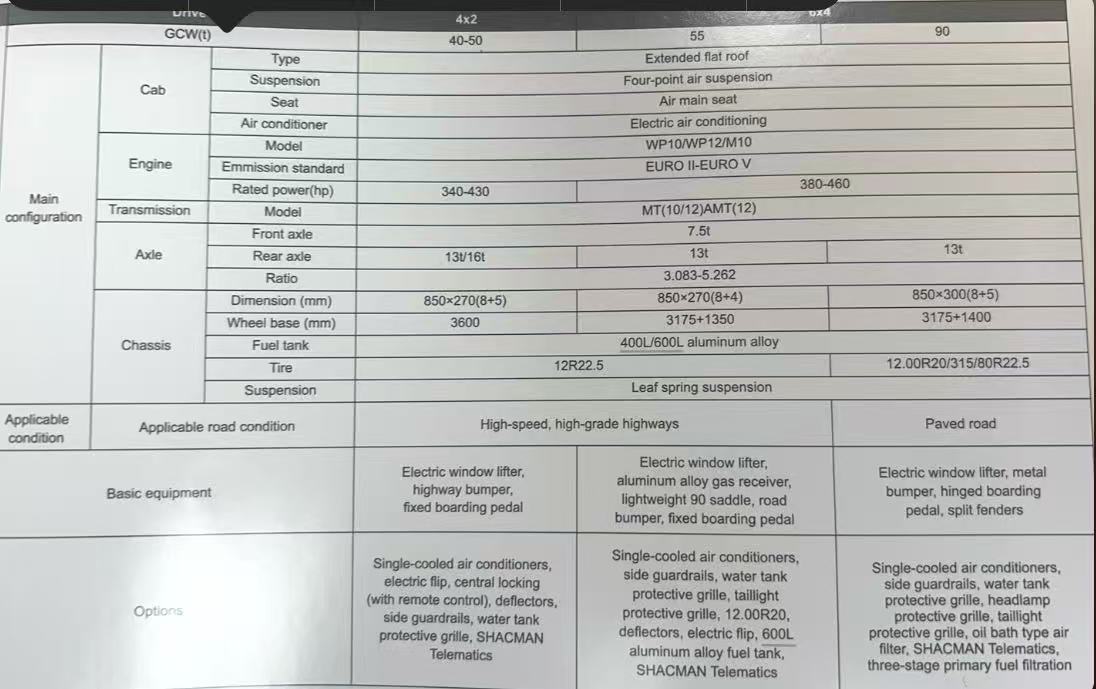 - Άξονες και ανάρτηση: Ο μπροστινός άξονας υιοθετεί την τεχνολογία Man 9.5T και ο πίσω άξονας υιοθετεί άξονα 13T ή 16T. Το σύστημα ανάρτησης υιοθετεί ελατηρίου χάλυβα υψηλής αντοχής, το οποίο μπορεί να αντέξει την επίδραση των βαρέων φορτίων και να εξασφαλίσει τη σταθερότητα και την ανθεκτικότητα του φορτηγού υπό περίπλοκες οδικές συνθήκες.
